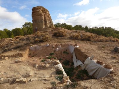 The Castle of Alcocer features a massive tower constructed from rammed earth, with foundations measuring approximately 10 by 16 meters at its base point.