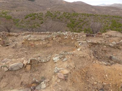 The remains of Torrecid castle include seven room foundations and low masonry walls covered with mud at an elevation of 663 meters.