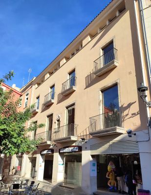 Located at 21-23 Placa de la Porxada, the three-story structure includes a ground floor, two main levels, and an attic with square window galleries.