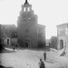 The church entrance displays classical style elements, including a rounded arch portal framed by columns supporting an entablature topped with a triangular pediment.