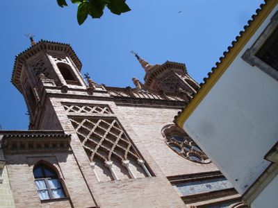 The Neo-Mudéjar monastery church features intricate brickwork patterns, decorative motifs, and architectural elements that reflect Andalusian design traditions.