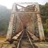 The metal bridge stretches across the Rio Tinto river, featuring steel trusses supported by two masonry pillars spanning 68 meters in length.