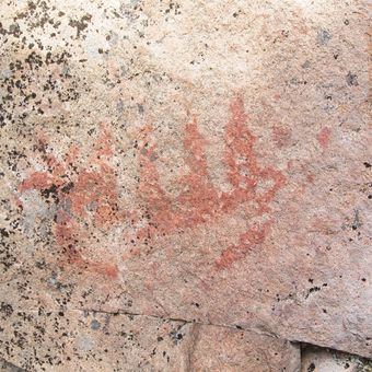 The red ochre paintings depict deer, human figures, boats, snakes, handprints, and geometric patterns, reflecting the life of early hunter-gatherer communities.