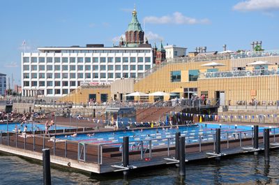 Visitors can experience swimming in heated pools surrounded by snow and ice during winter months, combining outdoor bathing with panoramic views of Helsinki's waterfront and the opportunity to enjoy dining at the Seagrill restaurant or drinks at the Sky Bar on the rooftop terrace.