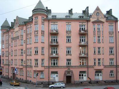 Construction of this residential building began in 1908 during Helsinki's urban development period, when the city expanded its housing infrastructure.