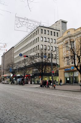 The Voima Building features clean lines and geometric forms, incorporating large windows and minimal decorative elements throughout its concrete facade structure.