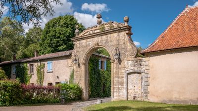 The monumental gateway arch from the 17th century stands alongside remnants of a 13th-century church with six bays and a polygonal apse.