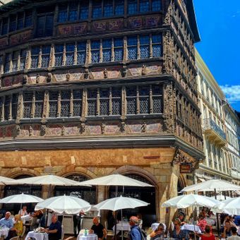Kammerzell House is a five-story residential building at Place de la Cathédrale in Strasbourg that features ornate timber framing, detailed stone carvings, and leaded glass windows. The structure combines late Gothic and Renaissance elements, with projecting bay windows and decorated half-timbered walls that define the appearance of the square.
