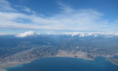 The Baie des Anges extends along the French Riviera coastline, bordered by five municipalities and receiving water from six different rivers flowing from the Maritime Alps.