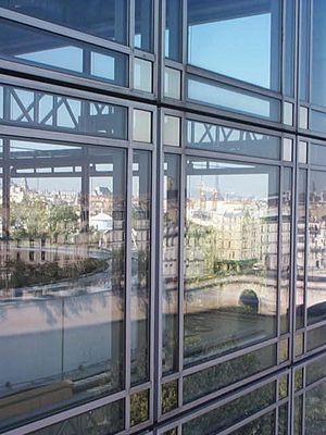 The building's north facade incorporates mirrored glass panels that reflect the Seine River and surrounding Parisian landscape, creating a visual dialogue between European and Arab architectural elements.