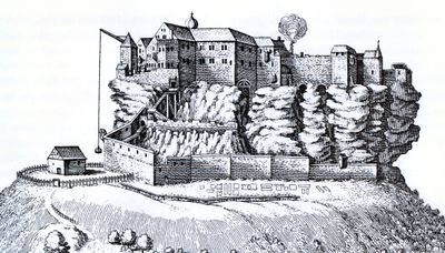 The castle's stone walls contain elements from different construction periods, including a Roman entrance gate integrated into medieval fortifications.