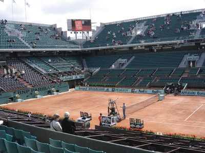 The courts feature a surface made of white limestone covered with red brick dust, creating the specific playing conditions of the French Open tournament.