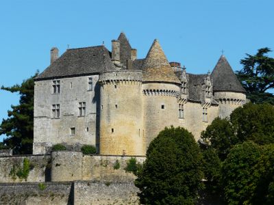 The Château de Fénelon rises above the Dordogne valley with its triple defensive walls and slate roofs, standing on rocky terraces between Périgord Noir and Quercy.