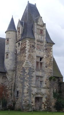 The castle combines local schist stone and Angevin tuffeau limestone in its construction, featuring a central pavilion flanked by two round towers at the gatehouse.