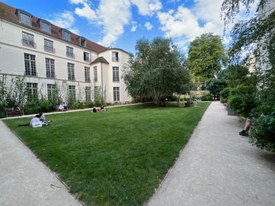 The space combines former private gardens of three mansions: Hotel de Coulanges, Hotel Barbes, and Hotel d'Albret, each section maintaining distinct characteristics.