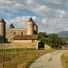 The castle features four corner towers, walls constructed from pebbles and schist, and windows decorated with white stone frames throughout its structure.