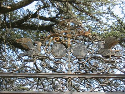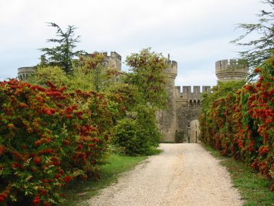 The castle combines architectural elements from different periods, featuring Gothic windows, an old well, and a monumental gate adorned with coat of arms.