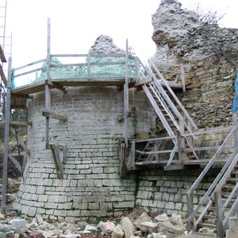 The fortress extends across 8 hectares of land, featuring remaining foundations of 27 towers and 5 former drawbridge locations overlooking the Serein River valley.