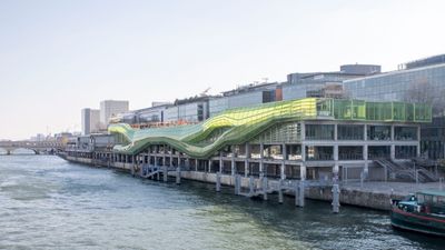 The Cité de la mode et du design spans four floors along the Seine River, featuring green exterior elements and large glass panels throughout the structure.