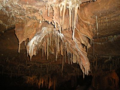 The cave system extends for 1,600 meters through limestone formations, featuring multiple chambers with stalactites, stalagmites, and underground lakes.