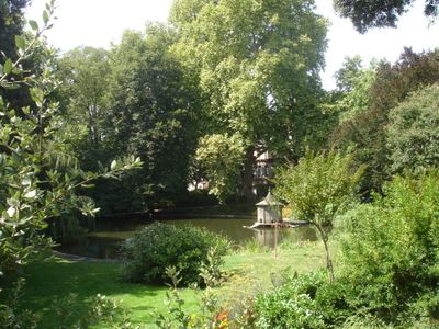 The Jardin Royal spans 1.7 hectares with winding paths, green lawns, and a central lake featuring a duck house and ornamental bridge.