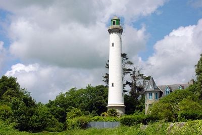 The Pyramid Lighthouse rises 48 meters above sea level on the left bank of the Odet River, guiding vessels with three red flashes every twelve seconds.