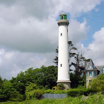 The lighthouse forms part of a maritime alignment system with Sainte-Marine lighthouse and Coq beacon, maintaining navigation safety at the Odet River mouth.