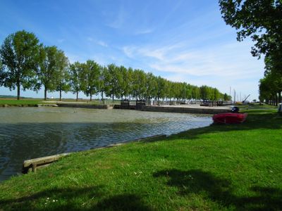 The harbor features green spaces, walking paths, and a basin for sailing lessons provided by the local sailing school.