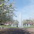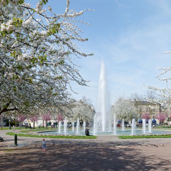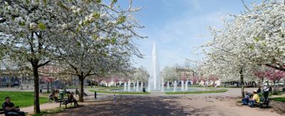 The square features a central fountain with seventeen water jets, surrounded by circular pathways and lined with plane trees reaching 110 meters in diameter.