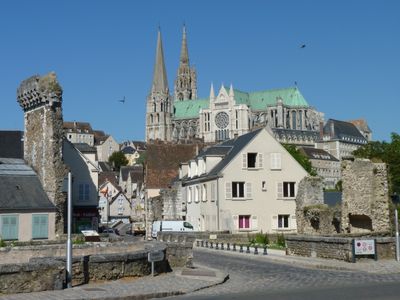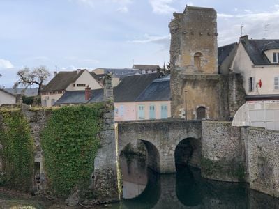 Porte Guillaume features two round towers with crenellations, arrow slits, and a pedestrian gate integrated into the fortified structure on the Eure River.