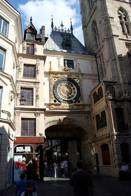 The street passes under a Renaissance arch that holds one of the oldest clock mechanisms in France, displaying both time and lunar phases.