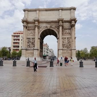 The Triumphal Arch, completed in 1839, displays ornate pillar decorations by Marneuf commemorating French military victories and Republican values.