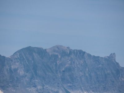 The summit contains the Trou de la Mouche, a natural rock arch formation that creates a distinctive silhouette against the mountain landscape.