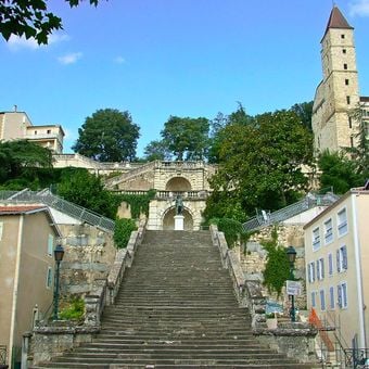 The Monumental Staircase spans 35 meters in height and contains 374 stone steps connecting the upper and lower sections of Auch through multiple terraces.