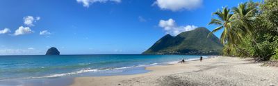 The three-kilometer beach features fine sand and opens to the Caribbean Sea with the Rocher du Diamant emerging from the waters.