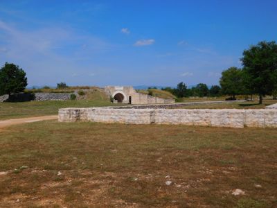 The remains include a praetorium, multiple room foundations, two surviving arches from the original five, and a military amphitheatre within Krka National Park.