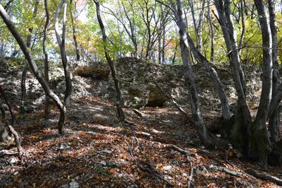 Oroszlánkő vára is a medieval fortress set high in the Vértes Mountains, with surviving stone walls and tower structures spread across the hilltop. The ruins reveal the layout of the original stronghold, showing how defensive features were positioned to control the surrounding landscape.