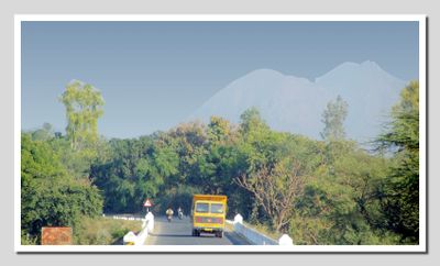 The Ambaji temple, constructed of white marble with golden cones, stands at the southwestern edge of the Aravalli mountain range near the Saraswati river.