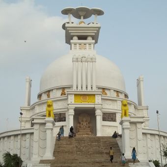 In the third century before Christ, Ashoka ordered inscriptions carved into the rock after the Kalinga War to announce his turn toward nonviolent principles. The pagoda was built in the 20th century by Japanese monks and now stands as a symbol of peace at this history-laden site.