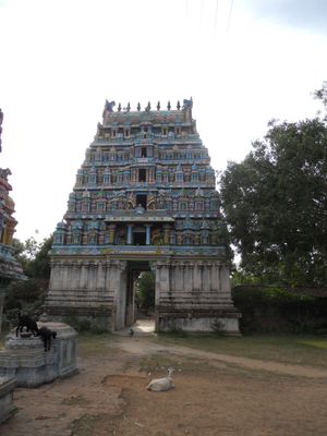 The temple features Dravidian architecture with a three-tiered Rajagopuram tower and two main corridors leading to the central sanctum.