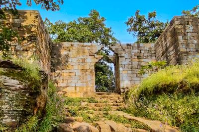 The stone fort stands at an elevation of 3060 feet on a hilltop, featuring three principal entrances named Menaka, Humkara, and Simhadwar.