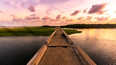 The Broken Bridge spans across the Adyar River, with its incomplete structure standing as a reminder of abandoned infrastructure projects in Chennai.