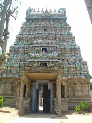 The Veezhinathar Kovil features stone sculptures and gateway towers following traditional Dravidian temple architecture with a central mandapa resembling a wedding hall.