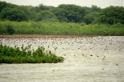 The sanctuary records between 20,000 and 60,000 birds during winter, including the Greater Spotted Eagle, Oriental Darter, and Black-headed Ibis species.