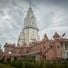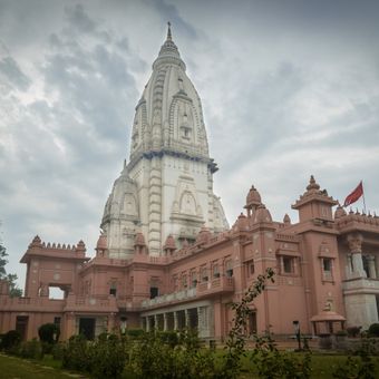 The New Vishwanath Temple is a Hindu temple on the Banaras Hindu University campus in Varanasi. The white structure displays stone walls carved with figures and patterns, while a tall spire rises above the roof and surrounds the domes of the inner halls.