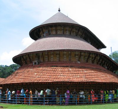 The temple sits on the banks of the Mogral river with a three-tiered copper-plated dome and contains intricate wooden carvings depicting Ramayana scenes.