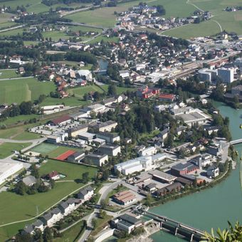 The municipality of Hallein stretches along the Salzach River at 447 meters elevation, surrounded by mountains and located south of Salzburg city.