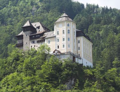 Schloss Klaus stands on an elevated position surrounded by dense forests of Upper Austria, featuring traditional architectural elements of Alpine noble residences.