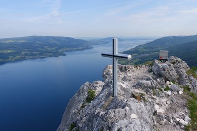The summit provides direct views of Lake Attersee's northern section and connects to a network of paths leading to neighboring Großer Schoberstein.