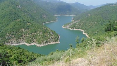 This reservoir features Bulgaria's first double curvature arch dam in cupola shape, with specialized spillway blocks managing flood discharge of 1,425 cubic meters per second.